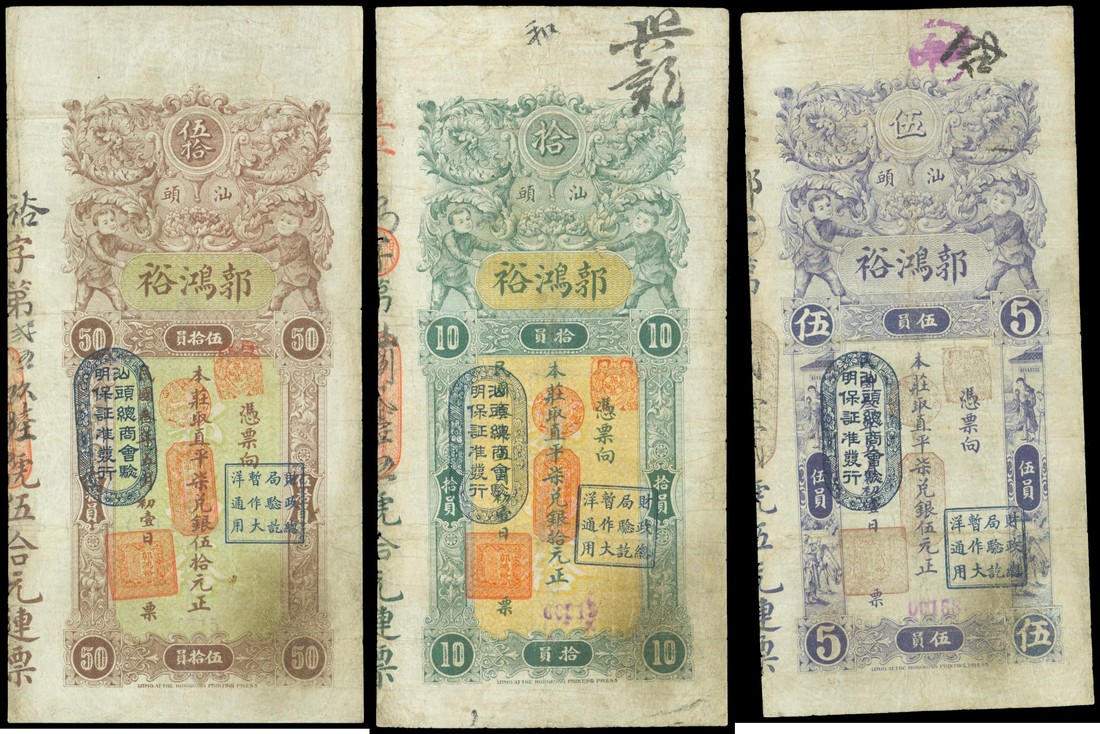 The Kok Hung Yue Bank, Swatow, 5 and 10 and 50 dollars, 1914, vertical format, dark blue, green and brown respectively, vertical format, attractive Chinese artwork on border, boys holding company name left and right at upper centre, text in Chinese obverse, English on reverse, globes at left,