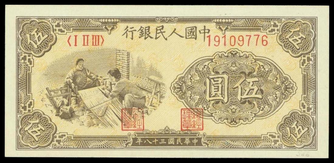 People's Bank of China, 1st series renminbi, 1949, 5yuan, serial number I II III 19109776, 'Weaving',