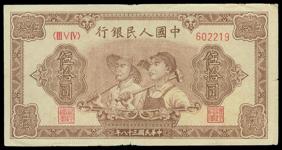 People's Bank of China, 1st series renminbi 1948-49, 50yuan, serial number III V IV 602219, 'Farmer and Factory Worker', the scarcer 6 digit variety,