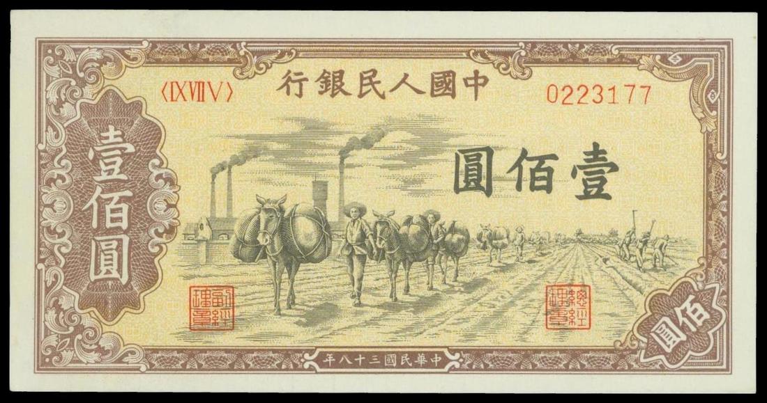People's Bank of China, 1st series renminbi, 100 Yuan, 1949, serial number IX VII V 0223177, violet and black on yellow underprint, 'Donkey', reverse green,