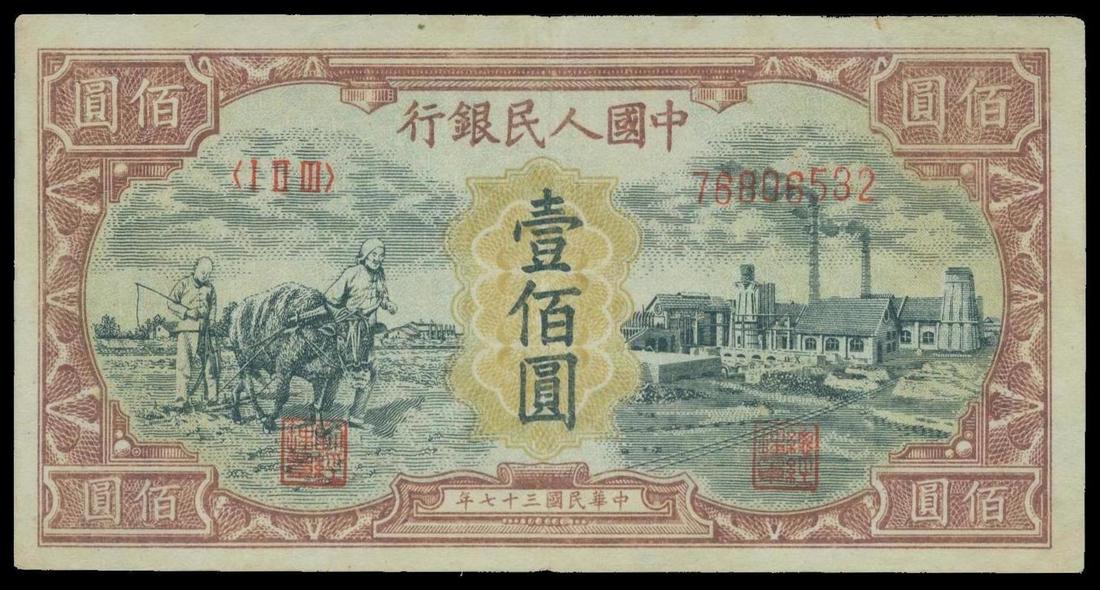 People's Bank of China, 1st series renminbi 1948-49, 100yuan, serial number I II III 76806532, 'Donkey and Factory',