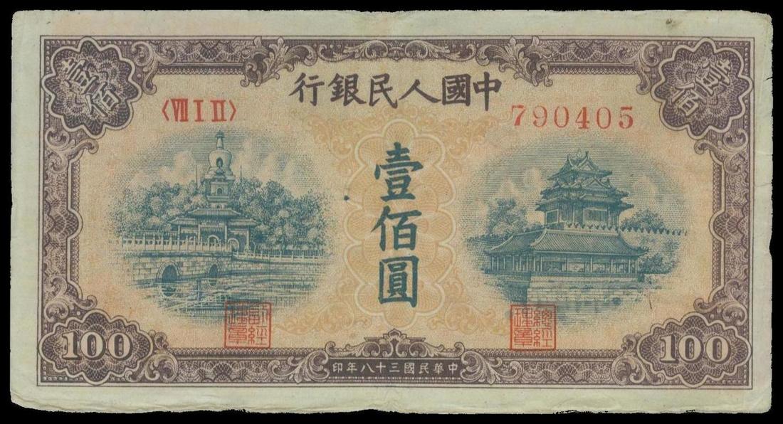People's Bank of China, 1st series renminbi 1948-49, 100yuan, serial number VII I II 790405, 'Blue Beihai Bridge', the scarcer wide seal variety,