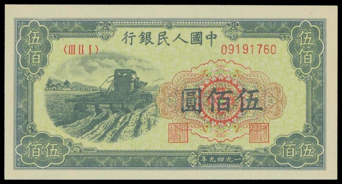 People's Bank of China, 1st series renminbi, 500 yuan, 'Tractor', 1949, serial number III II I 09191760, (Pick 846), PMG 58 choice about uncirculated.