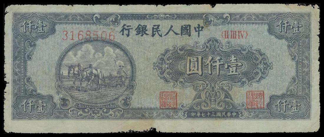 People's Bank of China, 1st series renminbi 1948-49, 1000yuan, serial number 3168506 II III IV, 'Two Horses Ploughing', the scarcer 7 digit variety,