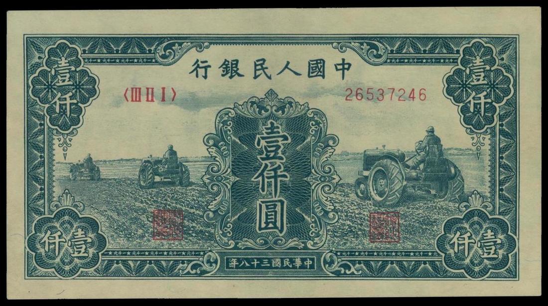 People's Bank of China, 1st series renminbi 1948-49, 1000yuan, serial number II II I 26537246, 'Three Tractors' ,