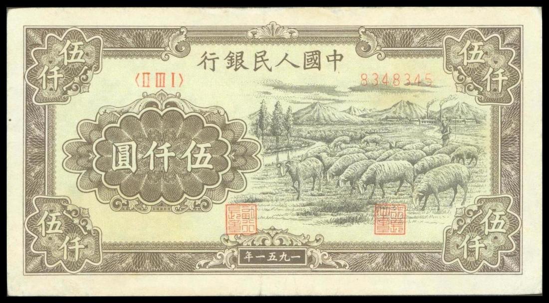 People's Bank of China, 1st series renminbi, 5000yuan, 1951, serial number II III I 8348345, 'Grazing Sheep' Uighur script on reverse,