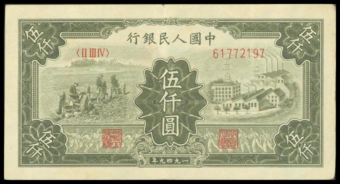 People's Bank of China, 1st series renminbi, 5000yuan, 1948-49, serial number II III IV 61772197, 'Tractors and Factory',