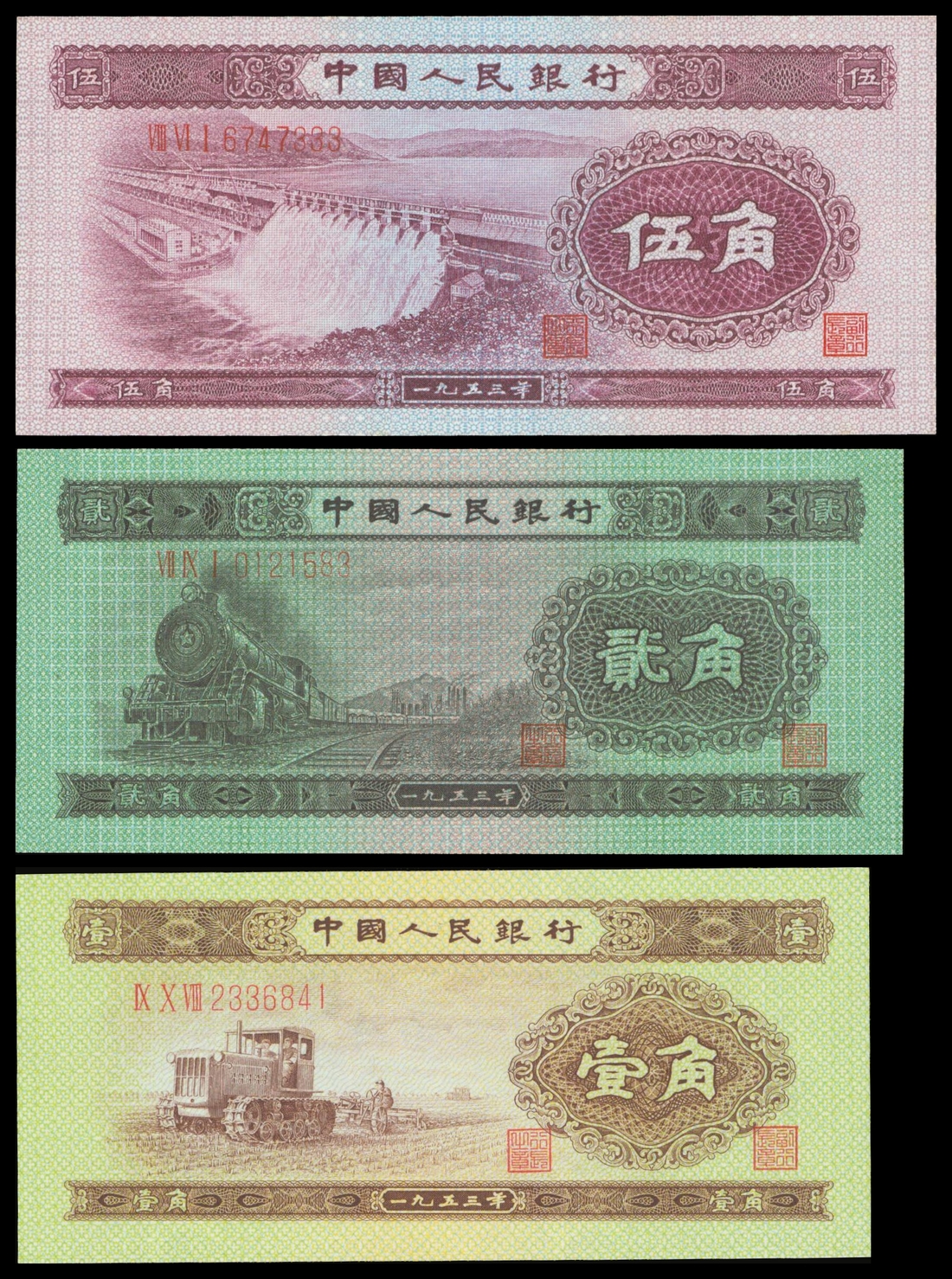 People's Bank of China, 2nd series renminbi, set of 1, 2 and 5jiao, 1953, brown-violet, green and purple respectively,