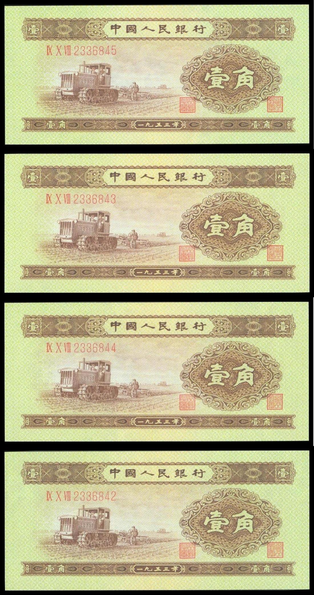 People's Bank of China, 2nd series renminbi, consecutive run of 4x 1jiao, 1953, serial number IX X VIII 2336842-45, brown-violet, tractor at left,