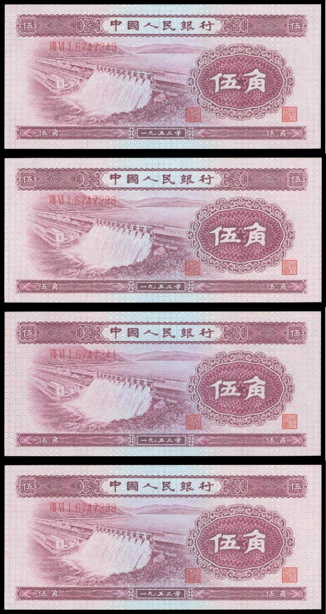 People's Bank of China, 2nd series renminbi, consecutive run of 4x 5jiao, 1953, serial number VIII VI I 6747338-41, purple, dam at left,
