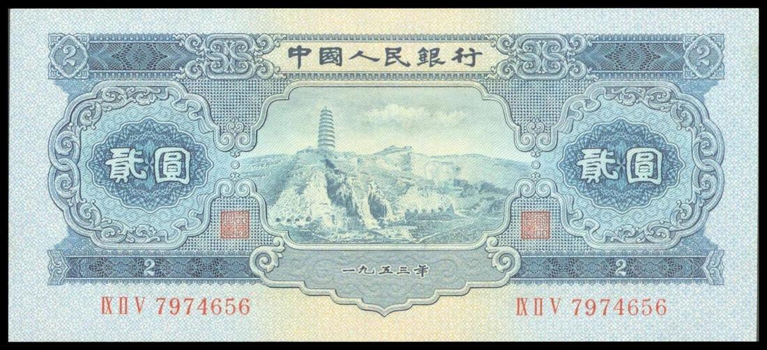 People's Bank of China, 2nd series renminbi, 2yuan, 1953, serial number IX II V 7974656, blue, pagoda at centre,