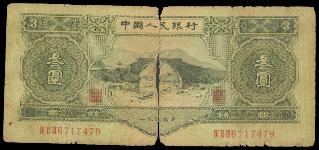 People's Bank of China, 2nd series renminbi, 3yuan, 1953, serial number I VI III 0782266, green, stone bridge at centre,