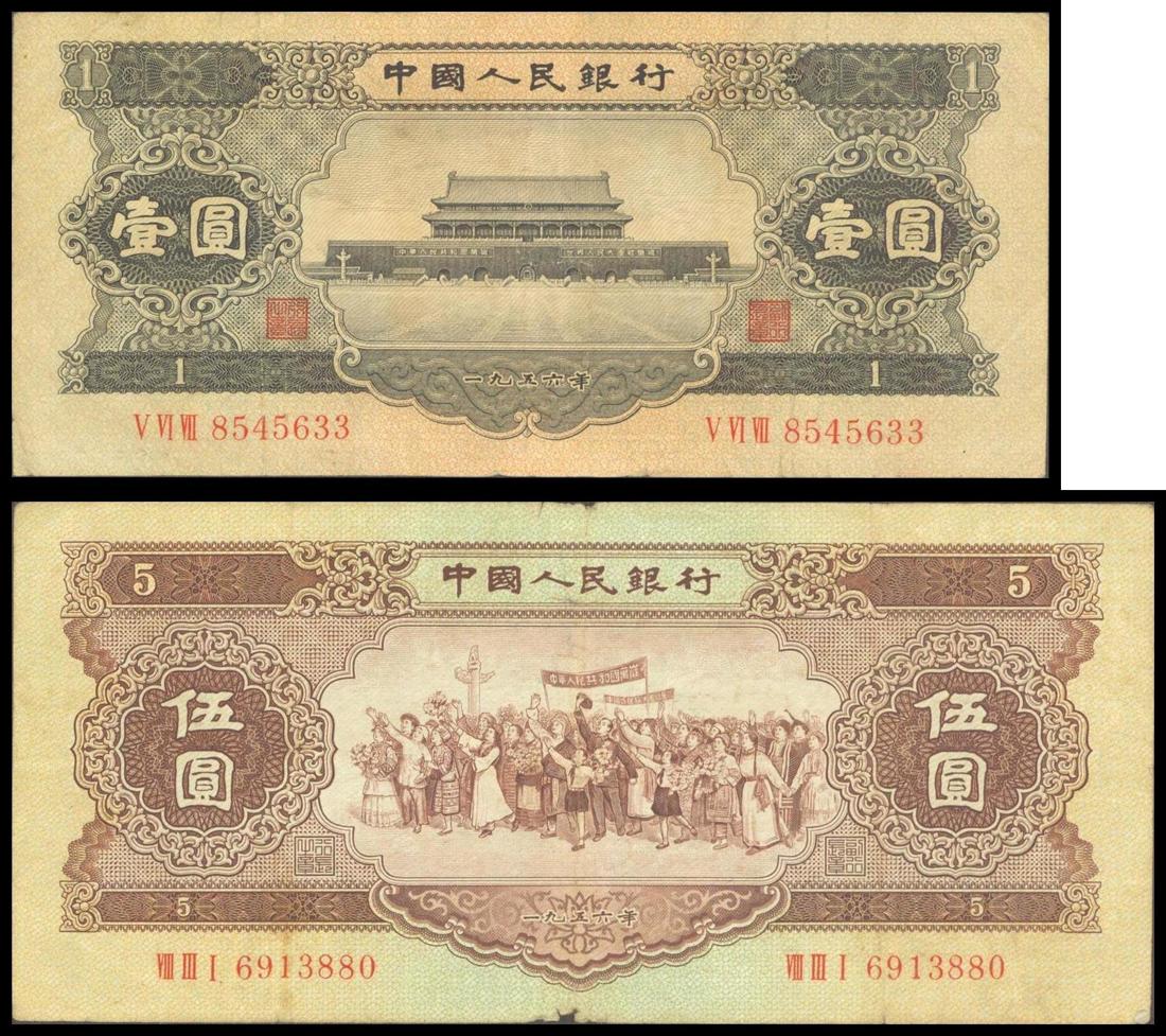 People's Bank of China, 2nd series renminbi, lot of 1yuan and 5yuan, 1956, black and brown respectively,