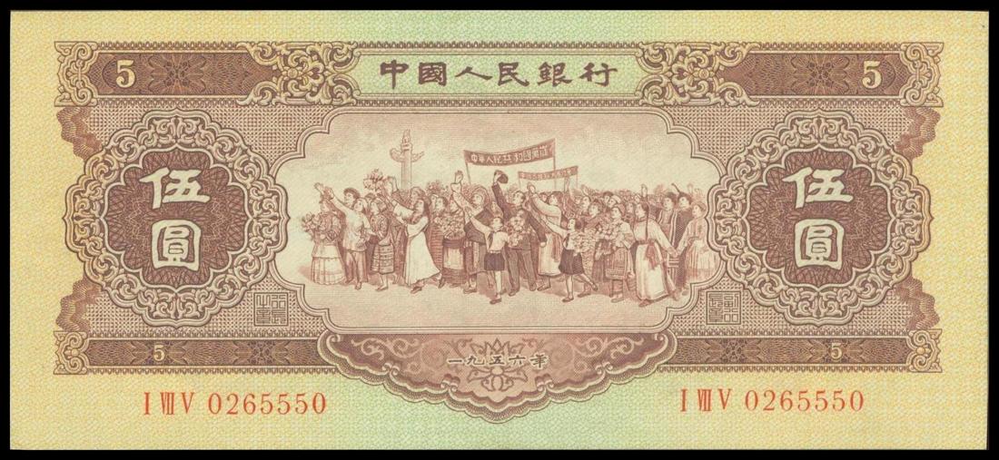 People's Bank of China, 2nd series renminbi, 5yuan, 1956, brown, green and yellow, demonstrators at centre, star watermark,