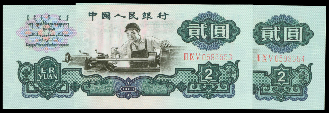 People's Bank of China, 3rd series renminbi, consecutive pair of 2yuan, 1960, serial number III IX V 0593553 - 554, green, machinist at centre,