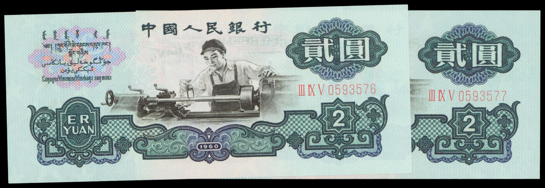 People's Bank of China, 3rd series renminbi, consecutive pair of 2yuan, 1960, serial number III IX V 0593576-577, green, machinist at centre,
