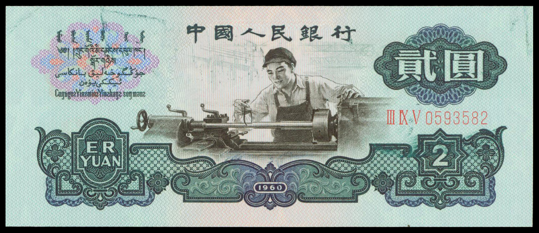 People's Bank of China, 3rd series renminbi, 2yuan, 1960, serial number III IX V 0593582, green, machinist at centre, inking errors smudges on obverse,