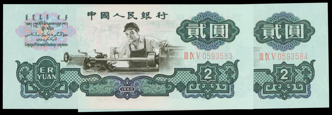 People's Bank of China, 3rd series renminbi, consecutive pair of 2yuan, 1960, serial numbers III IX V 0593583-584, green, machinist at centre,