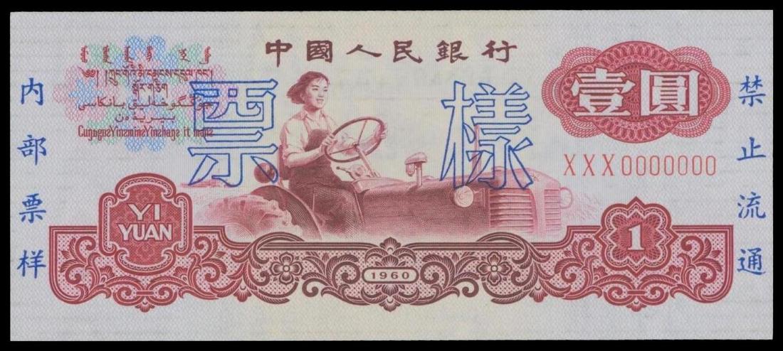 People's Bank of China, 3rd series renminbi, 1yuan Specimen, 1960, red and multicoloured, girl on tractor at centre, ancient coins watermark,