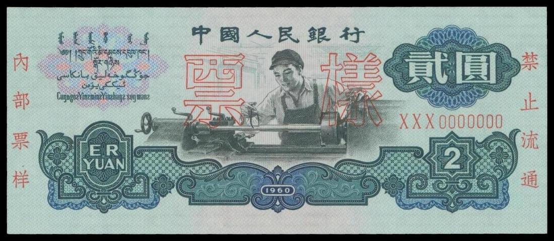 People's Bank of China, 3rd series renminbi, 2yuan Specimen, 1960, green and multicoloured, machinist at centre, ancient coins watermark,