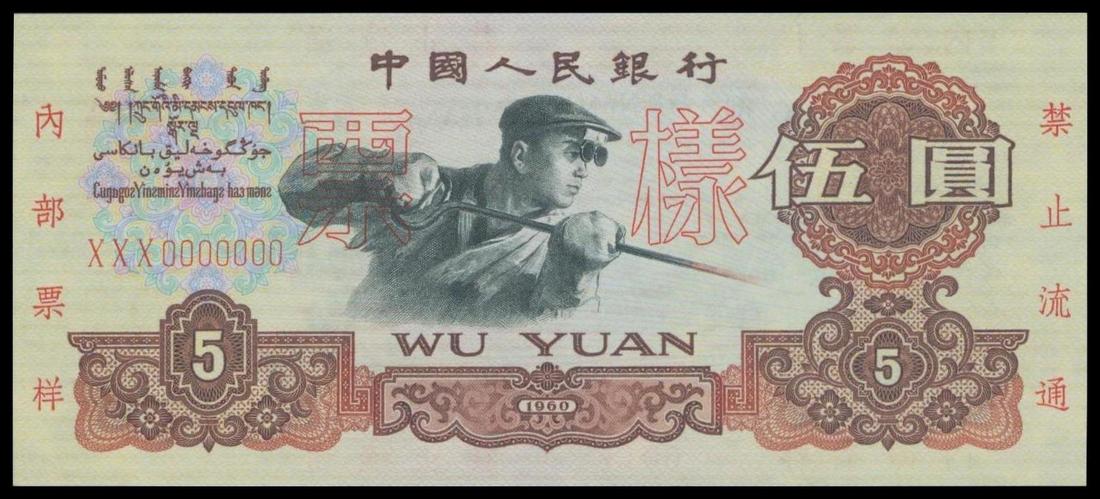 People's Bank of China, 3rd series renminbi, 5yuan Specimen, 1960, brown and multicoloured, foundry worker at centre, star watermark,
