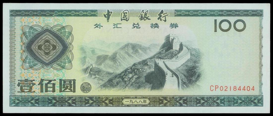 Bank of China, Foreign Exchange Certificate, 100 yuan, 1988, serial number CP02184404, green on multicolour underprint, Great Wall at centre, reverse green and multicolour border, text in Chinese and English,
