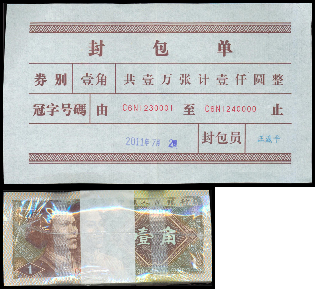 People's Bank of China, 4th series renminbi, 1 jiao, 1980, consecutive run of 1000, serial number C6N1234001 to C6N1235000, including the ascending number '1234567', purple and green, Gaoshan and Man ethnic men at right, with original wrappers and inspection certificate,