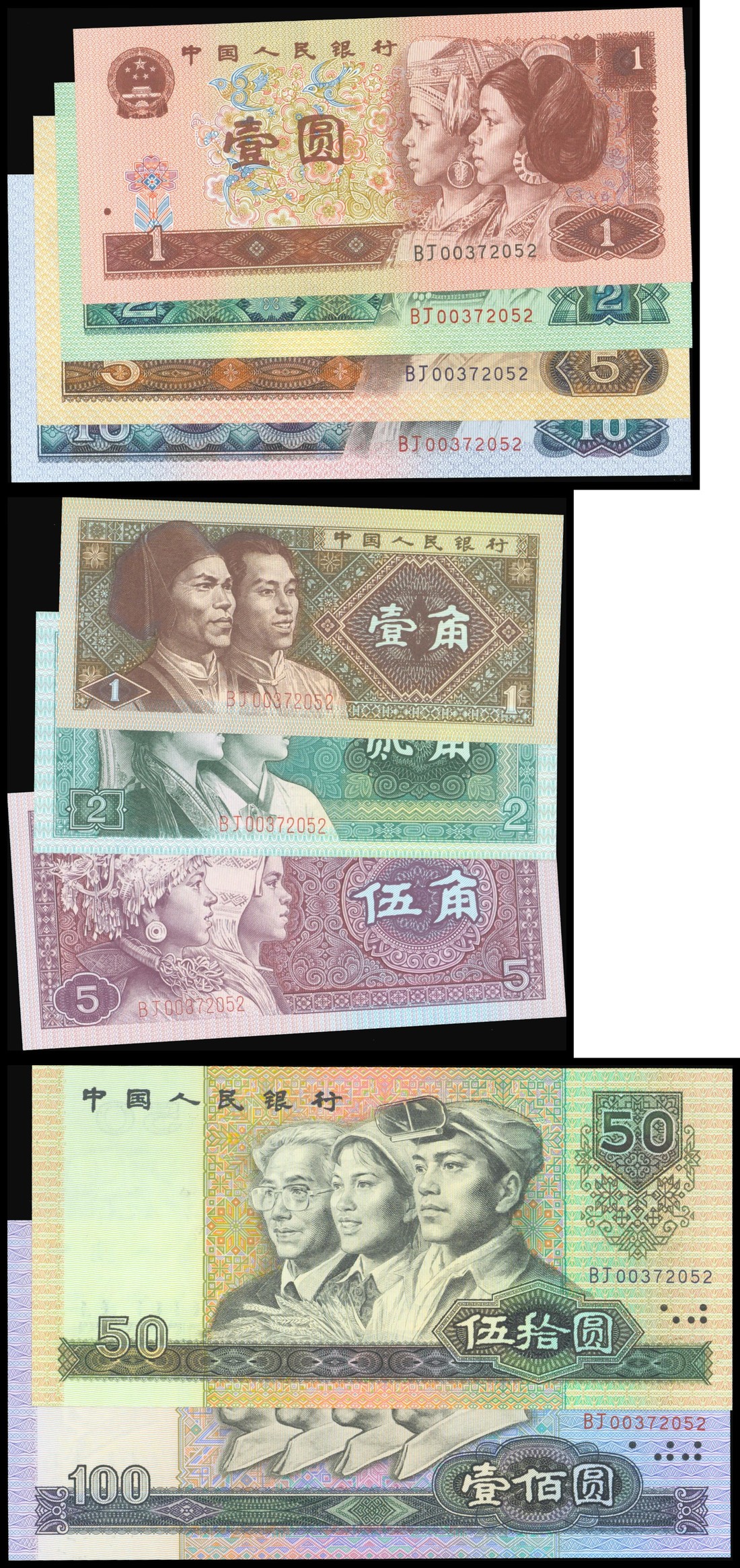 People's Bank of China, a set of 4th series renminbi, 1 jiao, 2 jiao, 5 jiao, 1 yuan, 2 yuan, 5 yuan, 10 yuan, 50 yuan, 100 yuan, same serial number BJ00372052, uncirculated.(9)