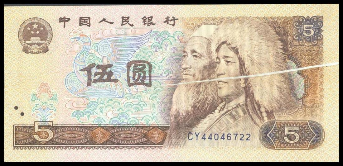 People's Bank of China, 4th series renminbi, error 5yuan, 1980, brown and multicolour, Tibetan man and Hui maiden at right, gutter fold from the right border to the centre,