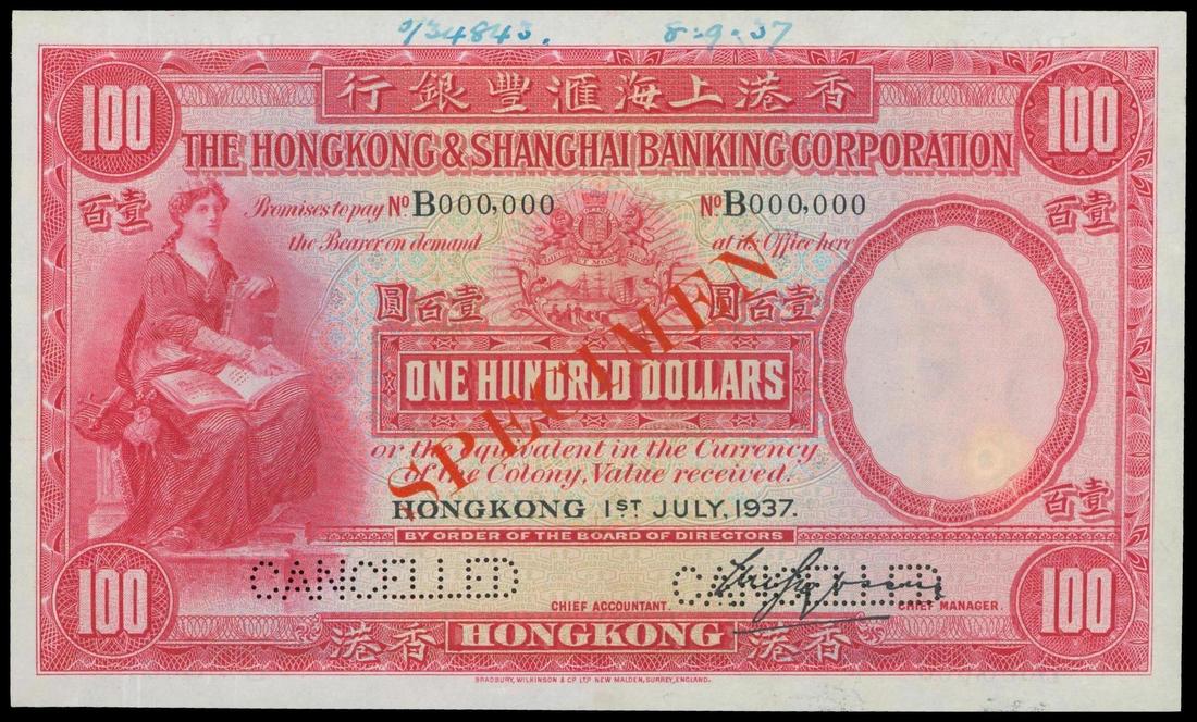 The HongKong and Shanghai Banking Corporation, $100, Specimen, 1937, serial number B000000, red on multicoloured underprint, maiden at left, arms top centre, value at centre and each corner, manuscript signatures at bottom, 'SPECIMEN' overprinted in red, reverse red, bank building at centre, angel above, serial number at four corners,