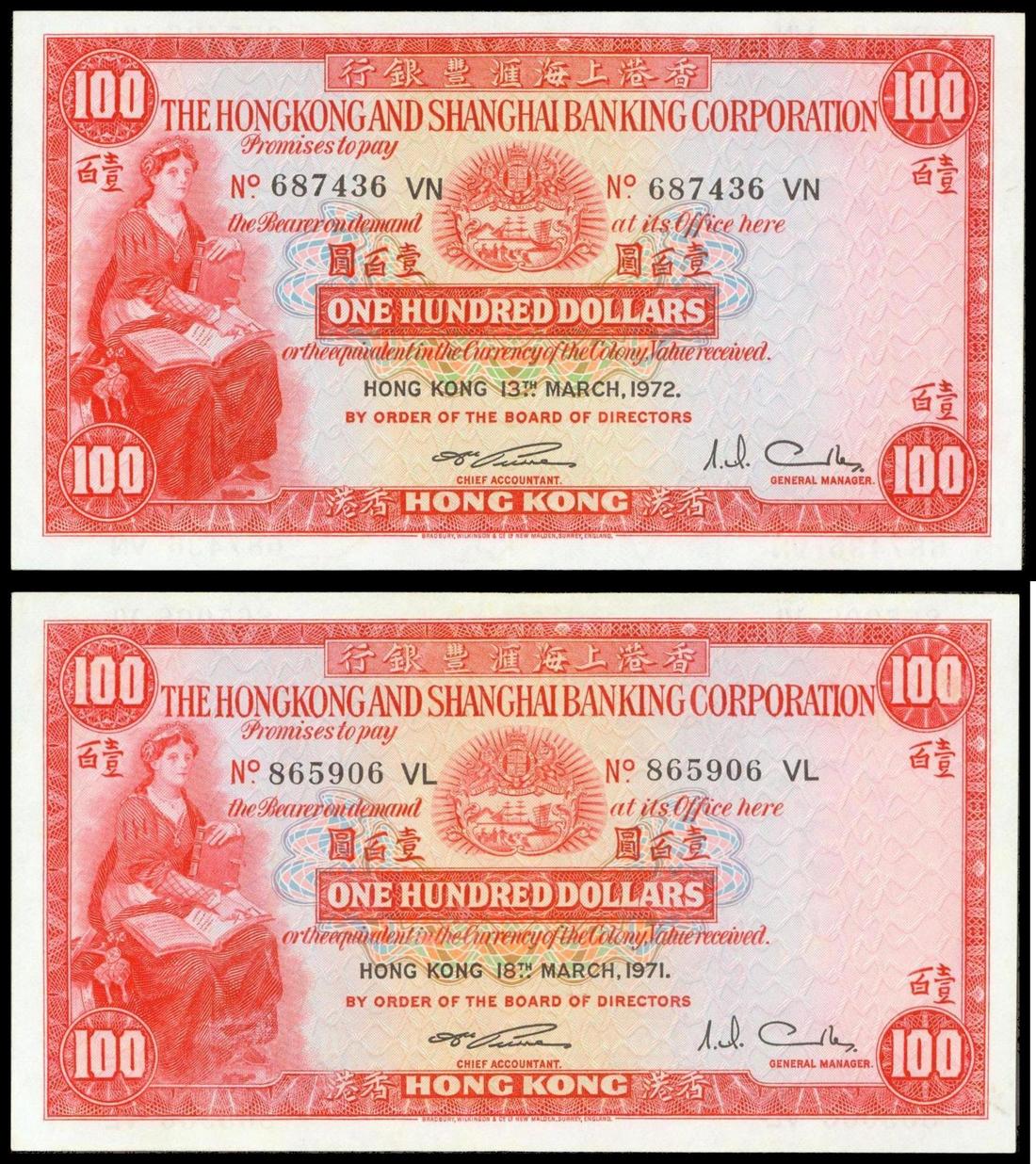 The HongKong and Shanghai Banking Corporation, lot of 2x $100, 1971 and 1972, serial numbers 865906Vl and 687436VN, red and multicoloured, 'Justicia' sitting with an open book at left, coat of arms top centre, watermark of helmeted warrior at right, reverse red, the old HSBC building at centre,
