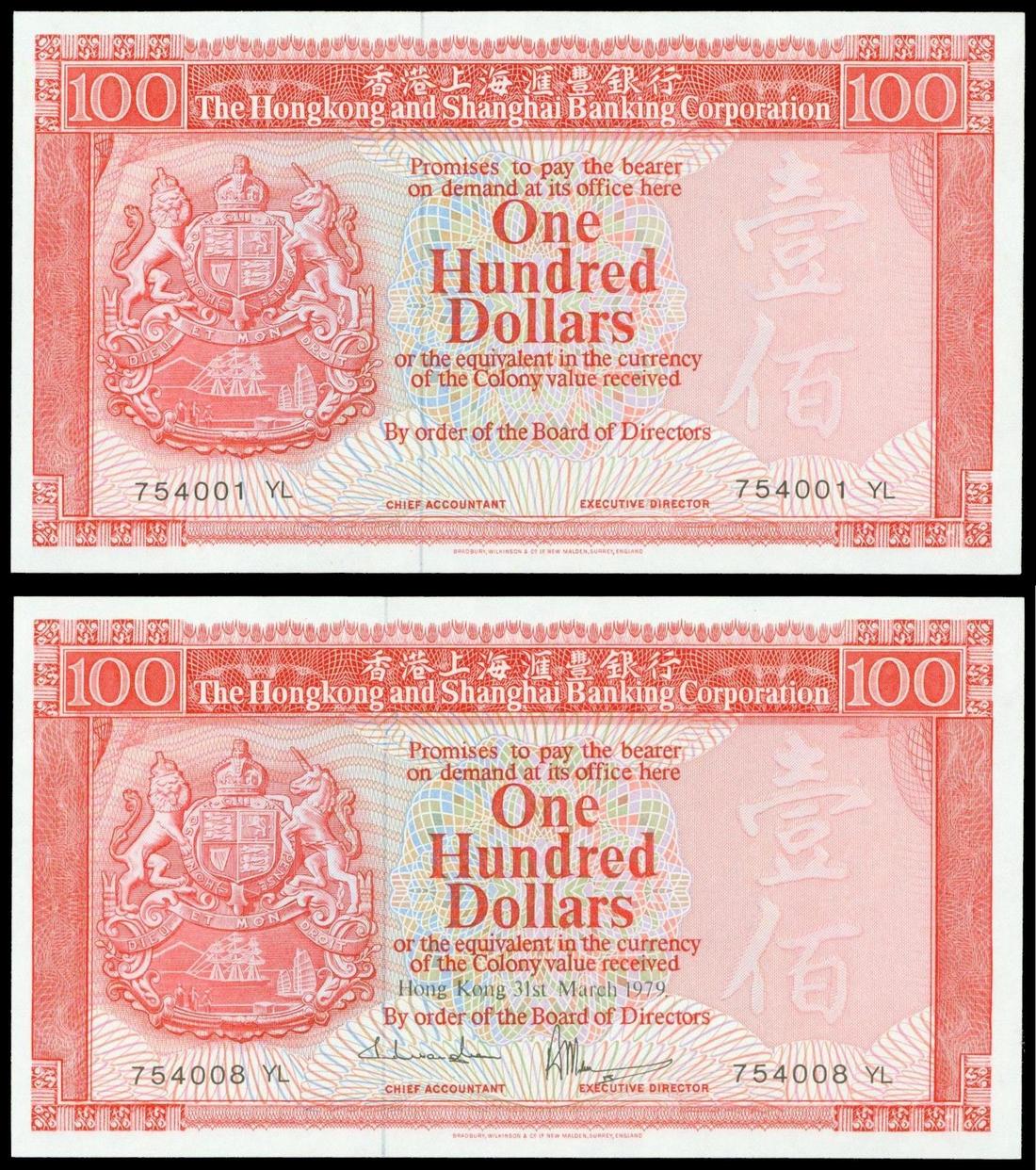 Hong Kong & Shanghai Banking Corporation, $100,printing error of date and signatures omitted, serial number 754001 YL, together with a normal note 754008 YL for comparison,