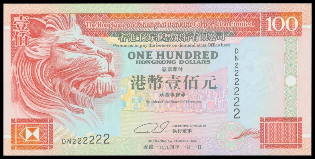 Hong Kong and Shanghai Banking Corporation, $100, 1 January 1994, 'lucky' number DN222222, red and multicolourd, lion's head at left, reverse red, lions flanking bank building at centre, pagoda at right,