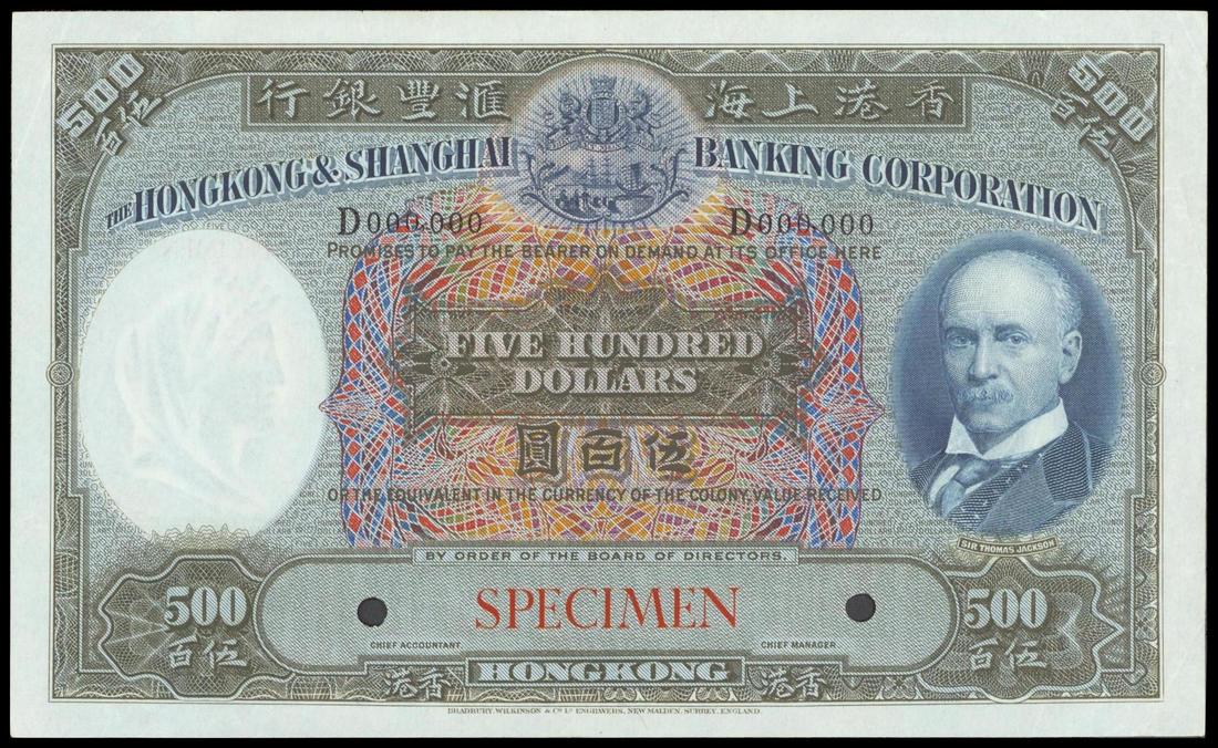 The HongKong and Shanghai Banking Corporation, $500, 'colour trial', undated, green-brown and multicoloured, Sir Thomas Jackson at right, coat of arms top centre and watermark of a woman at left, reverse green, old HSBC building at centre,
