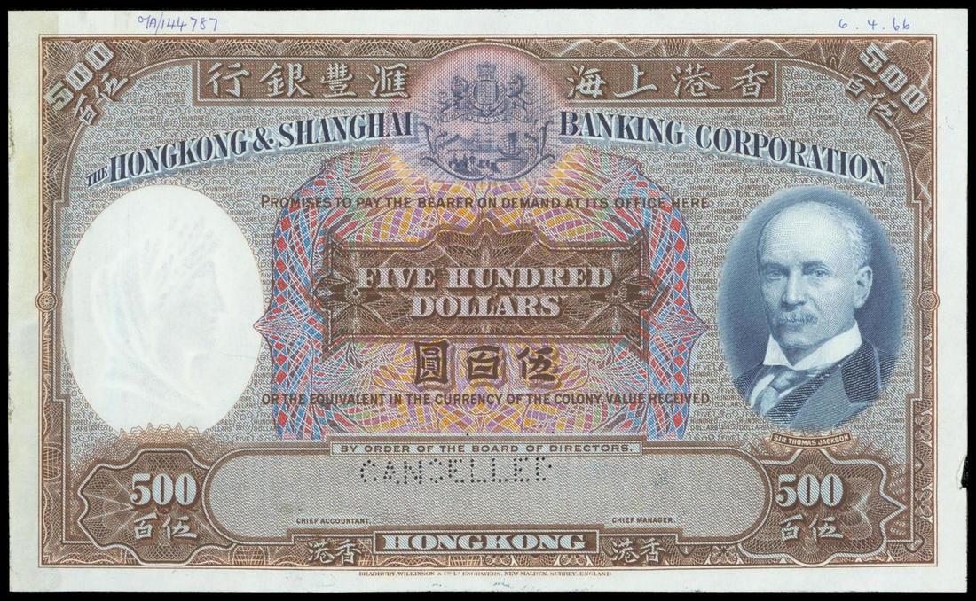 The HongKong and Shanghai Banking Corporation, $500, proof/specimen', undated, brown and multicoloured, Sir Thomas Jackson at right, coat of arms top centre and watermark of a woman at left, 'CANCELLED' perforated bottom centre, reverse blue, old HSBC building at centre,