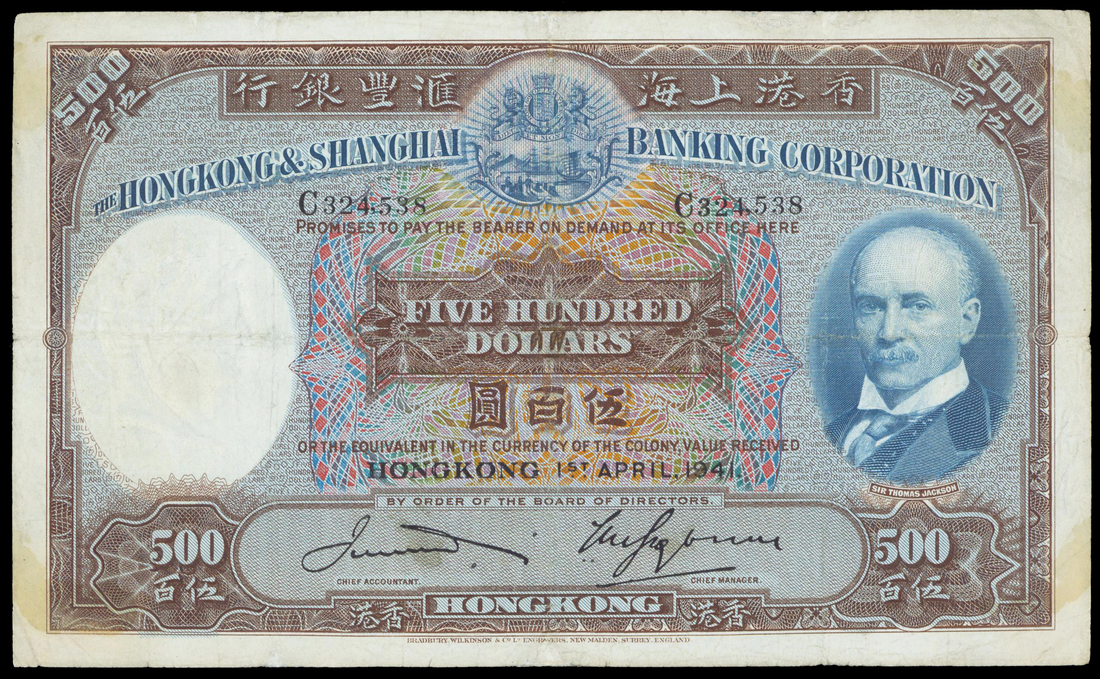 The HongKong and Shanghai Banking Corporation, $500, 1941, serial number C324538, brown, blue and multicoloured, Sir Thomas Jackson at right, two printed signatures,