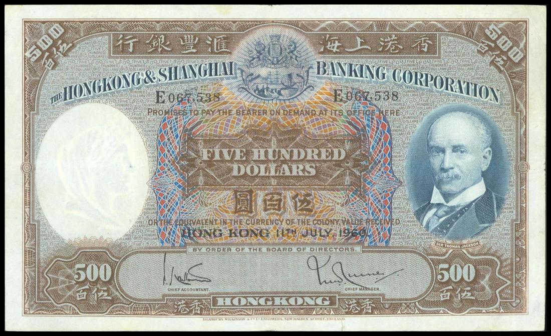 The HongKong and Shanghai Banking Corporation, $500, 1960, serial number E067538, brown, blue and multicoloured, Sir Thomas Jackson at right, two printed signatures,