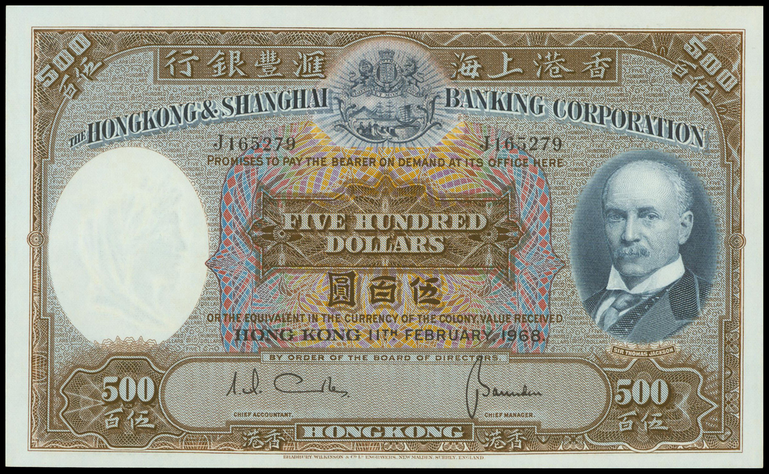 The HongKong and Shanghai Banking Corporation, $500, 1968, serial number J165279, brown, blue and multicoloured, Sir Thomas Jackson at right, coat of arms top centre, watermark of a woman in classical style at left, reverse blue, bust of woman at left and old HSBC building at centre,