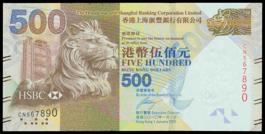 Hong Kong & Shanghai Banking Corporation, $500, 1 January 2010, ascending serial number CN567890, brown and yellow, lion in front of bank building at left, watermark of flower at right, reverse brown on multicolour underprint, scene of Lunar New Year,