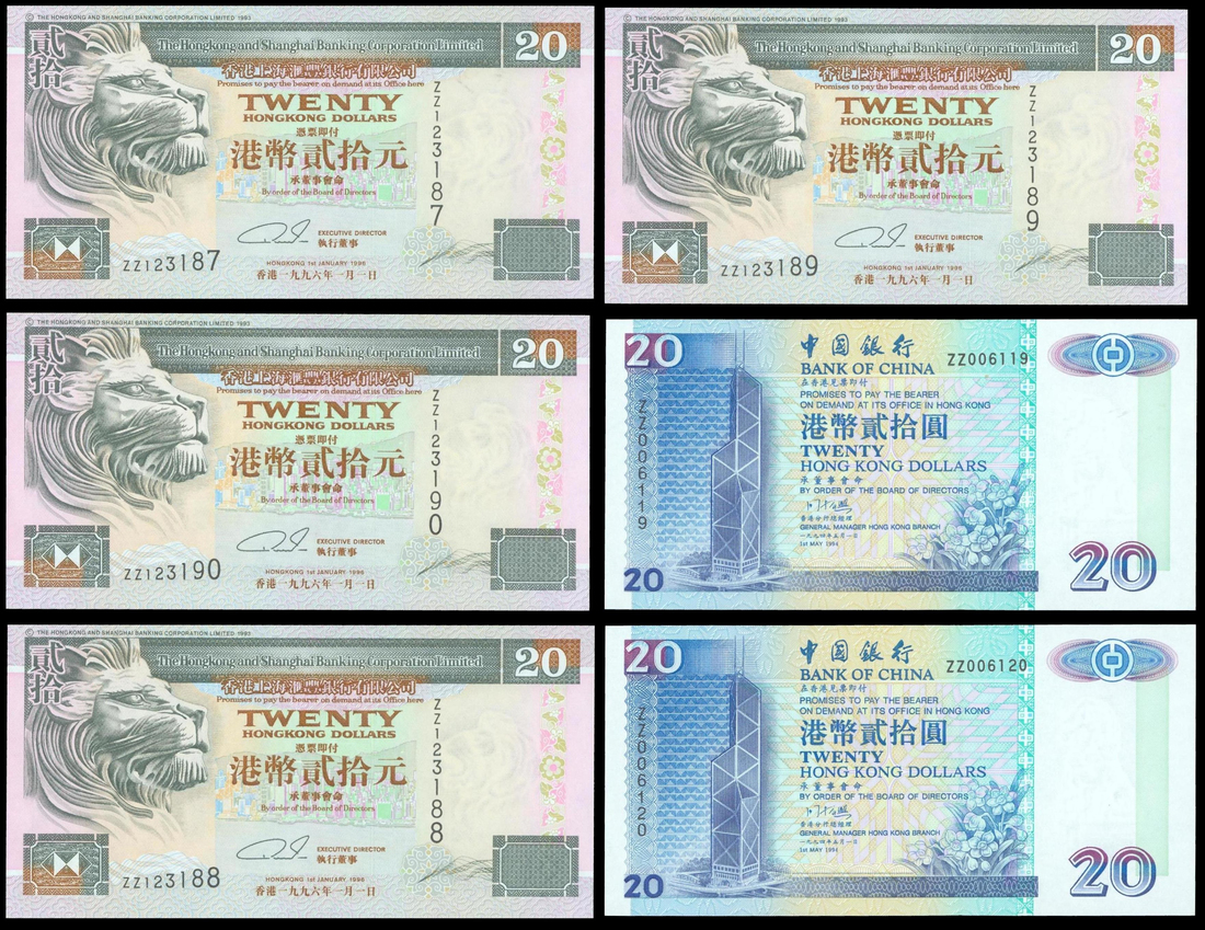 Mixed lot of Hong Kong and Shanghai Banking Corporation, $20(4), 1996, and Bank of China, $20(2), 1994, consecutive 'Replacement' notes with prefix ZZ,