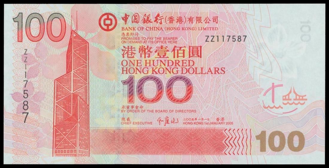 Bank of China, $100, 2005, replacement prefix ZZ117587, red and multicoloured, BOC building at left, bauhinia watermark at right, Tsing Ma Bridge on reverse,
