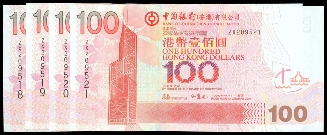 Bank of China, lot of 4x $100, 2009, replacement prefix ZX209518-521, red and multicoloured, BOC building at left, bauhinia watermark at right, Tsing Ma Bridge on reverse,