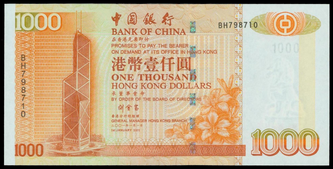Bank of China, $1000, 2001, serial number BH798710, orange and multicolour, bank building at left, watermark at right,reverse orange and multicolour underprint, view of Victoria harbour from Peak,