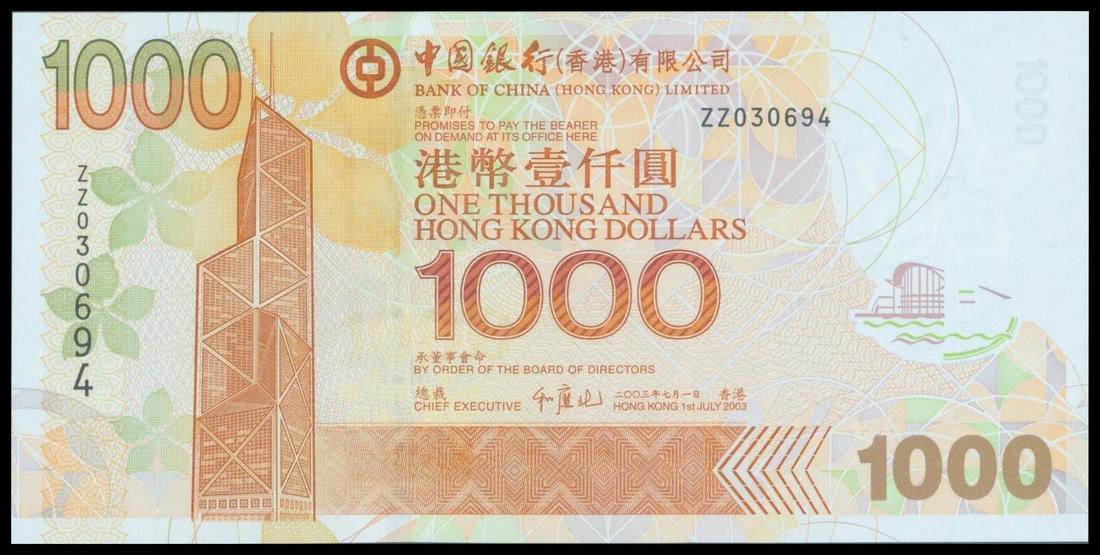 Bank of China, $1000, 2003, serial number ZZ030694, orange and multicolour, BOC building at left, bauhinia watermark at right, Exhibition Centre on reverse,