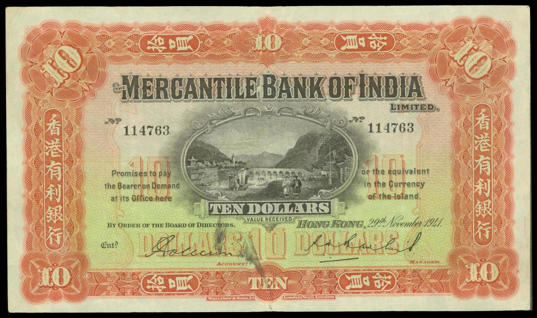 Mercantile Bank of India Limited, $10, 29 November 1941, serial number 114763, red and pale green, coastline scene with junk at centre, value at corners, two printed signatures below, reverse green and black, Mercury at centre,