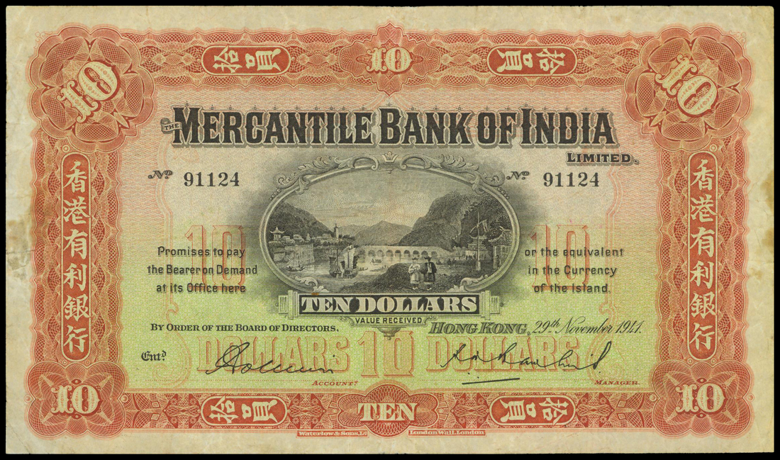 Mercantile Bank India, $10, 1941, serial number 91124, red-brown on yellow and green underprint, sampan, houses and bridge near lakeside at centre, reverse green and black, Mercury with winged helmet at centre,