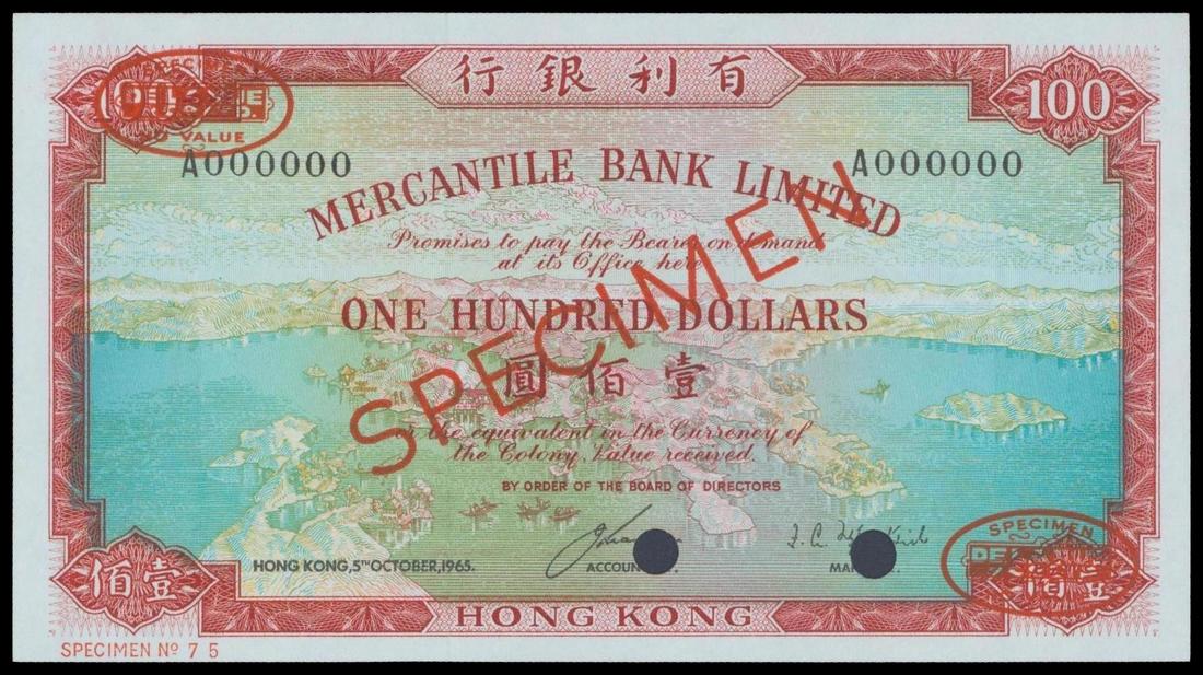 Mercantile Bank Limited, $100, 'Specimen', 1965, serial number A000000, red and turquoise, aerial view of Hong Kong Island at bottom, red oval De La Rue seals top left and right, reverse red and yellow, Britannia at centre,