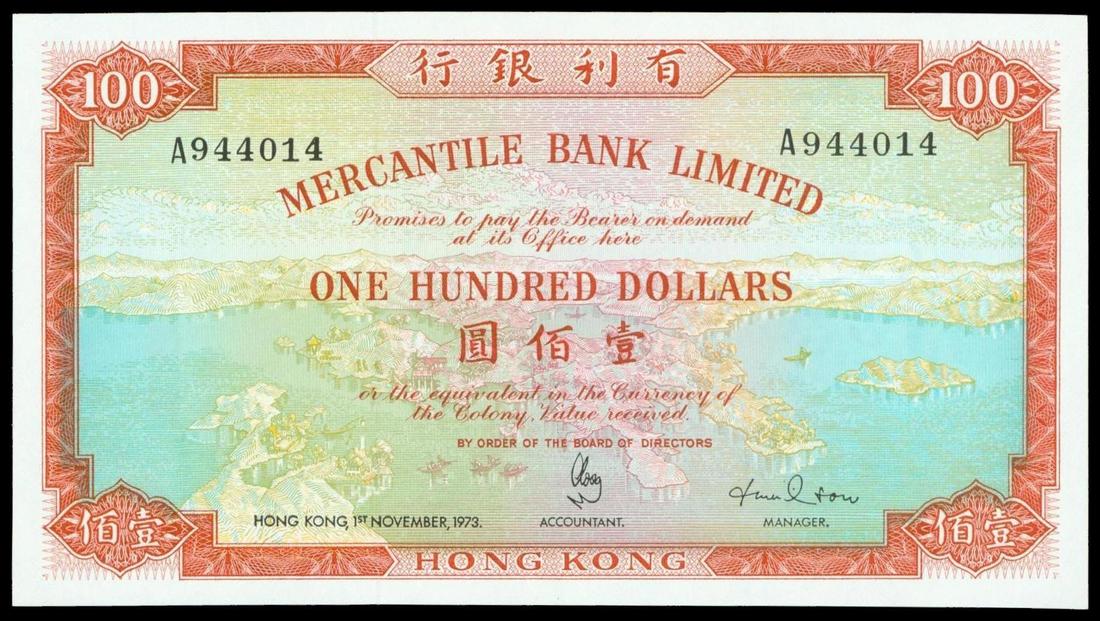Mercantile Bank Limited, $100,1 November 1973, serial number A944014, red and multicoloured, view of Hong Kong at centre, reverse red, Britannia at centre, value at each corner
