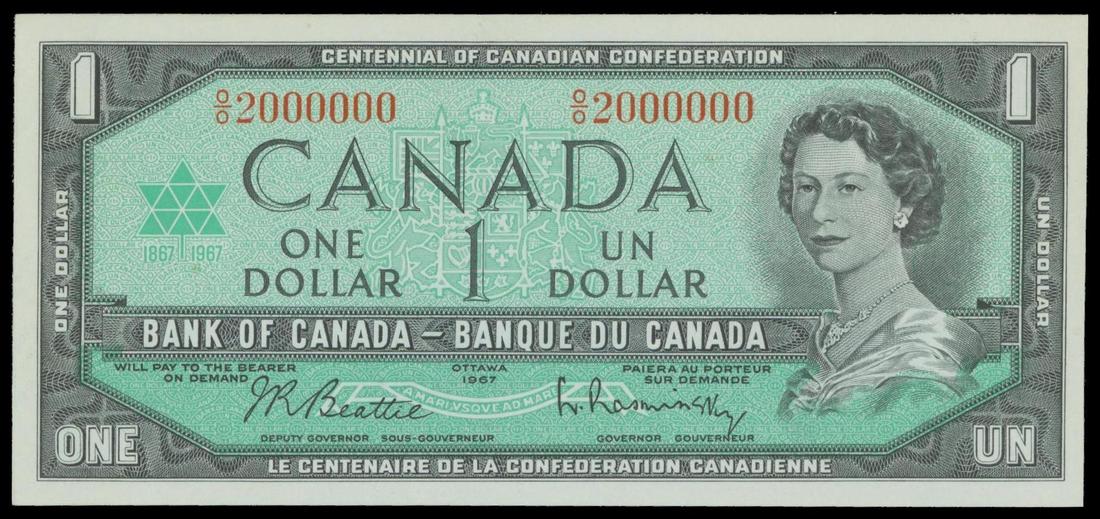 Canada, $1, 1967, 'Centennial Issue', serial number o/o 2000000, black on green, Elizabeth II at right, reverse green, Parliament building,