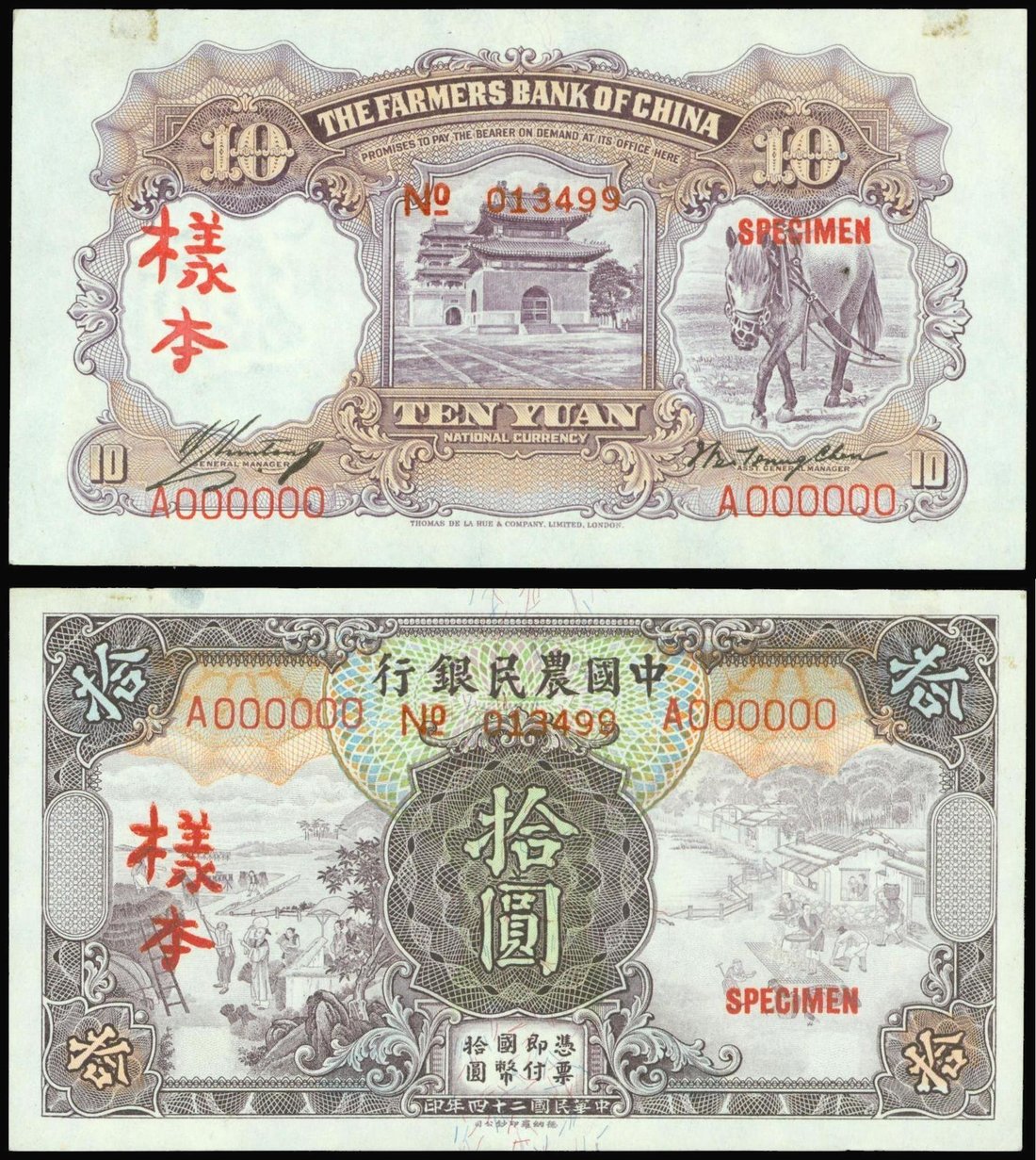 Farmers Bank of China, uniface obverse and reverse specimen for 10yuan, number 013499,1934, purple, farming scenes left and right, Chinese style towers and donkey on reverse,